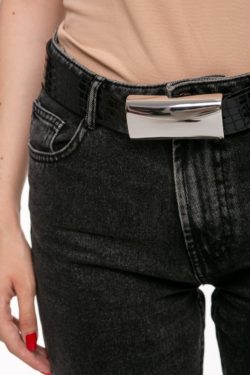Curea piele sintetica neagra-nabuc cu catarama metalica-placa argintie 6cm