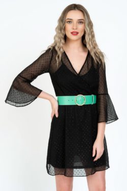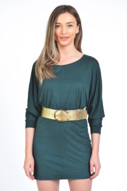 Curea de dama din piele naturala verde cu catarama metalica rotunda aurie si strasuri 6 cm