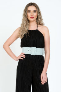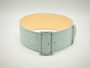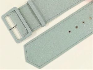 Curea imbracata in tesatura din poliester cu lurex cusuta pe margini prevazuta cu 5 ocheti metalici argintii,ac argintiu si gaica latime 8cm