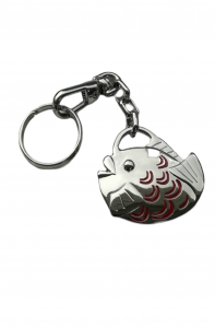 Breloc metalic in forma de peste,culoare argintiu /rosu prevazut cu carabiniera metalica pentru prindere .