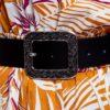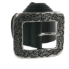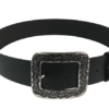 Curea din piele naturala neagra ,lucioasa prevazuta cu catarama metalica argintie si motive florale lata de 4cm