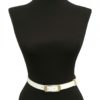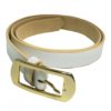 Curea din piele naturala alba prevazuta cu catarama metalica aurie,latime 2 cm. Marimea S are lungimea totala 95 cm si talia de 75 cm (reprezinta lungimea masurata din bara cataramei pana la gaura din mijloc a curelei). Marimea M are lungimea totala 105 cm si talia de 85 cm (reprezinta lungimea masurata din bara cataramei pana la gaura din mijloc a curelei).