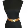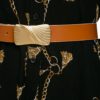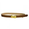 Curea din piele naturala maro-camel prevazuta cu catarama aurie, mata tip placa,latime 3 cm. Marimea S are lungimea totala 95 cm si talia de 75 cm (reprezinta lungimea masurata din bara cataramei pana la gaura din mijloc a curelei). Marimea M are lungimea totala 105 cm si talia de 85 cm (reprezinta lungimea masurata din bara cataramei pana la gaura din mijloc a curelei).