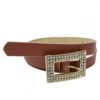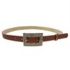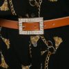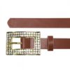 Curea din piele naturala maro cu catarama metalica aurie si strasuri aplicate. Latime 2 cm. Marimea S are lungimea totala 95 cm si talia de 75 cm (reprezinta lungimea masurata din bara cataramei pana la gaura din mijloc a curelei). Marimea M are lungimea totala 105 cm si talia de 85 cm (reprezinta lungimea masurata din bara cataramei pana la gaura din mijloc a curelei).
