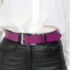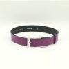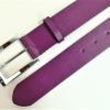 Curea din piele naturala culoare mov prevazuta cu catarama metalica argintie si strasuri. Latime 4 cm. Marimea S are lungimea totala 95 cm si talia de 75 cm (reprezinta lungimea masurata din bara cataramei pana la gaura din mijloc a curelei). Marimea M are lungimea totala 105 cm si talia de 85 cm (reprezinta lungimea masurata din bara cataramei pana la gaura din mijloc a curelei).