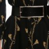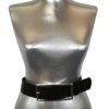 Curea din piele naturala neagra,lucioasa prevazuta cu catarama metalica argintie. Latime 5 cm. Marimea S are lungimea totala 95 cm si talia de 75 cm (reprezinta lungimea masurata din bara cataramei pana la gaura din mijloc a curelei). Marimea M are lungimea totala 105 cm si talia de 85 cm (reprezinta lungimea masurata din bara cataramei pana la gaura din mijloc a curelei).