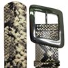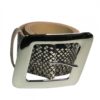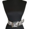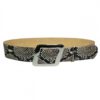 Curea din piele naturala cu print ce imita pielea de sarpe,gri, prevazuta cu catarama metalica argintie, latime 5 cm. Marimea S are lungimea totala 95 cm si talia de 75 cm (reprezinta lungimea masurata din bara cataramei pana la gaura din mijloc a curelei). Marimea M are lungimea totala 105 cm si talia de 85 cm (reprezinta lungimea masurata din bara cataramei pana la gaura din mijloc a curelei).