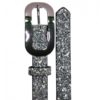 Curea din glitter neagra prevazuta cu catarama metalica argintie. Latime 2 cm. Marimea S are lungimea totala 95 cm si talia de 75 cm (reprezinta lungimea masurata din bara cataramei pana la gaura din mijloc a curelei). Marimea M are lungimea totala 105 cm si talia de 85 cm (reprezinta lungimea masurata din bara cataramei pana la gaura din mijloc a curelei).