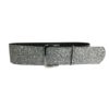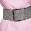 Curea din imitatie piele – glitter argintiu prevazuta cu catarama metalica argintie lata de 8 cm . Marimea S are lungimea totala 95 cm si talia de 75 cm (reprezinta lungimea masurata din bara cataramei pana la gaura din mijloc a curelei). Marimea M are lungimea totala 105 cm si talia de 85 cm (reprezinta lungimea masurata din bara cataramei pana la gaura din mijloc a curelei).