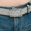 Curea din imitatie piele-glitter argintiu prevazuta cu catarama metalica argintie lata de 3 cm. Marimea S are lungimea totala 95 cm si talia de 75 cm (reprezinta lungimea masurata din bara cataramei pana la gaura din mijloc a curelei). Marimea M are lungimea totala 105 cm si talia de 85 cm (reprezinta lungimea masurata din bara cataramei pana la gaura din mijloc a curelei).