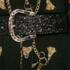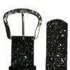 Curea din glitter, neagra, prevazuta cu catarama metalica argintie si strasuri, latime 4.5cm. Marimea S are lungimea totala 95 cm si talia de 75 cm (reprezinta lungimea masurata din bara cataramei pana la gaura din mijloc a curelei). Marimea M are lungimea totala 105 cm si talia de 85 cm (reprezinta lungimea masurata din bara cataramei pana la gaura din mijloc a curelei).