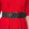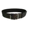 Curea din piele sintetica-glitter negru-auriu cu catarama metalica argintie lata de 6 cm. Marimea S are lungimea totala 95 cm si talia de 75 cm (reprezinta lungimea masurata din bara cataramei pana la gaura din mijloc a curelei). Marimea M are lungimea totala 105 cm si talia de 85 cm (reprezinta lungimea masurata din bara cataramei pana la gaura din mijloc a curelei).