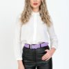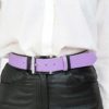 Curea de dama din piele naturala lila cu print ce imita pielea de crocodil prevazuta cu catarama metalica argintie si strasuri ,latime 4 cm .