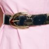 Curea din piele naturala multicolora cu print ce imita pielea de sarpe, catarama metalica aurie, latime 4cm. Marimea S are lungimea totala 95 cm si talia de 75 cm (reprezinta lungimea masurata din bara cataramei pana la gaura din mijloc a curelei). Marimea M are lungimea totala 105 cm si talia de 85 cm (reprezinta lungimea masurata din bara cataramei pana la gaura din mijloc a curelei).