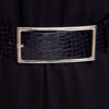 Curea din piele naturala neagra cu print ce imita pielea de crocodil prevazuta cu catarama metalica argintie, latime 5 cm. Marimea S are lungimea totala 95 cm si talia de 75 cm (reprezinta lungimea masurata din bara cataramei pana la gaura din mijloc a curelei). Marimea M are lungimea totala 105 cm si talia de 85 cm (reprezinta lungimea masurata din bara cataramei pana la gaura din mijloc a curelei).