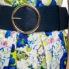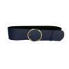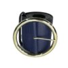 Curea din imitatie de piele blaumarin prevazuta cu catarama metalica rotunda aurie lata de 8cm. Marimea S are lungimea totala 95 cm si talia de 75 cm (reprezinta lungimea masurata din bara cataramei pana la gaura din mijloc a curelei). Marimea M are lungimea totala 105 cm si talia de 85 cm (reprezinta lungimea masurata din bara cataramei pana la gaura din mijloc a curelei).