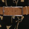 Curea din imitatie piele maro cu model prevazuta cu catarama metalica argintie lata de 5 cm . Marimea S are lungimea totala 95 cm si talia de 75 cm (reprezinta lungimea masurata din bara cataramei pana la gaura din mijloc a curelei). Marimea M are lungimea totala 105 cm si talia de 85 cm (reprezinta lungimea masurata din bara cataramei pana la gaura din mijloc a curelei).