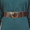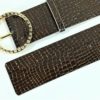 Curea din piele sintetica maro cu print ce imita pielea de crocodil prevazuta cu catarama metalica rotunda aurie si strasuri aplicate,latime 6cm. Marimea S are lungimea totala 95 cm si talia de 75 cm (reprezinta lungimea masurata din bara cataramei pana la gaura din mijloc a curelei). Marimea M are lungimea totala 105 cm si talia de 85 cm (reprezinta lungimea masurata din bara cataramei pana la gaura din mijloc a curelei).