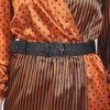Curea din piele sintetica neagra cu model preavazuta cu catarama metalica argintie, latime 4 cm. Marimea S are lungimea totala 95 cm si talia de 75 cm (reprezinta lungimea masurata din bara cataramei pana la gaura din mijloc a curelei). Marimea M are lungimea totala 105 cm si talia de 85 cm (reprezinta lungimea masurata din bara cataramei pana la gaura din mijloc a curelei).