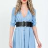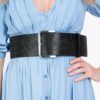 Curea din piele sinitetica neagra cu model prevazuta cu catarama metalica argintie, latime 8 cm.Marimea S are lungimea totala 95 cm si talia de 75 cm (reprezinta lungimea masurata din bara cataramei pana la gaura din mijloc a curelei). Marimea M are lungimea totala 105 cm si talia de 85 cm (reprezinta lungimea masurata din bara cataramei pana la gaura din mijloc a curelei).