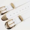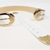 Curea din piele naturala alba prevazuta cu doua catarame metalice si accesorii (gaica si capat curea) in finisaj auriu latime 4cm