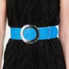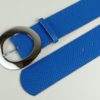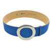 Curea de dama din piele naturala albastra cu print ce imita pielea de crocodil prevazuta cu catarama metalica rotunda argintie,latime 6cm .