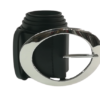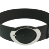 Curea din piele naturala neagra ,lucioasa prevazuta cu catarama metalica ovala argintie lata de 6 cm.