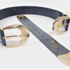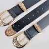 Curea din piele naturala neagra prevazuta cu doua catarame metalice si accesorii (gaica si capat curea) in finisaj auriu latime 4cm