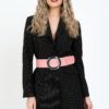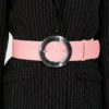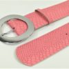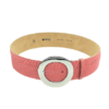 Curea de dama din piele naturala roz cu print ce imita pielea de crocodil prevazuta cu catarama metalica rotunda argintie,latime 6cm .