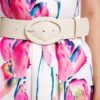 Curea din imitatie piele bej cu catarama imbracata ovala, culoarea ton in ton cu materialul curelei 5cm. Marimea S are lungimea totala 95 cm si talia de 75 cm (reprezinta lungimea masurata din bara cataramei pana la gaura din mijloc a curelei). Marimea M are lungimea totala 105 cm si talia de 85 cm (reprezinta lungimea masurata din bara cataramei pana la gaura din mijloc a curelei).
