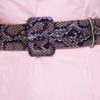 Curea din imitatie piele mov cu print ce imita pielea de sarpe prevazuta cucatarama imbracata ton in ton cu materialul curelei latime 5 cm. Marimea S are lungimea totala 95 cm si talia de 75 cm (reprezinta lungimea masurata din bara cataramei pana la gaura din mijloc a curelei). Marimea M are lungimea totala 105 cm si talia de 85 cm (reprezinta lungimea masurata din bara cataramei pana la gaura din mijloc a curelei).