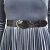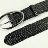 Curea din imitatie piele cu print croco neagra si catarama metalica argintie lata de 4 cm. Marimea S are lungimea totala 95 cm si talia de 75 cm (reprezinta lungimea masurata din bara cataramei pana la gaura din mijloc a curelei). Marimea M are lungimea totala 105 cm si talia de 85 cm (reprezinta lungimea masurata din bara cataramei pana la gaura din mijloc a curelei).