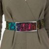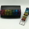Set cadou format din doua piese : Plic din piele naturala neagra,luciosa cu aplicatie si inchidere multicolora ,dimensiuni 27×10×17 si curea din piele naturala multicolora cu catarama metalica dreptunghiulara argintie ,dimensiuni 105 – 95 x 5cm .